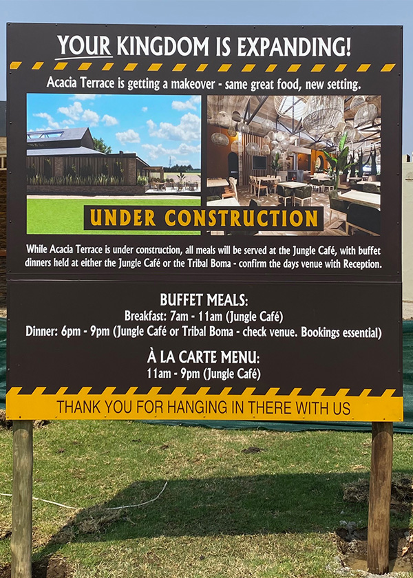 Our restaurant is currently being refurbished, evolving from The Acacia Terrace Restaurant into the brand-new Acacia Table. While it's still under construction, the redesigned space promises a luxurious, modern and welcoming atmosphere perfect for enjoying meals after a day exploring the Pilanesberg wildlife or the nearby Sun City attractions. Families and couples alike can look forward to a refreshed dining experience that complements the resort's activities and amenities.